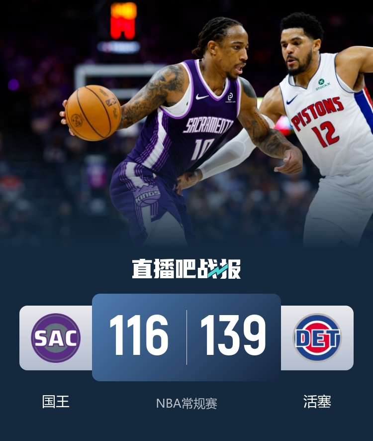 直播吧1月26日讯 NBA常规赛,活塞主场迎战国王。活塞32胜11负东部第一,国王12胜34负西部第14,近期4连败。