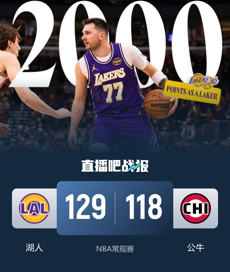 比赛开场,詹姆斯进攻欲望很强,连续完成得分,但公牛同样屡屡做出回应,双方陷入拉锯战,节末湖人打出一波9-0,以35-31领先进入第二节。次节回来,詹姆斯延续状态,半场砍下20分,和东契奇一起继续延续球队攻势,公牛连续出现失误被打反击,一度落后到20分,但半场前还是稍稍蚕食分差,半场结束湖人69-56领先。易边再战,公牛继续追分势头,一度将分差缩小到1分,但东契奇本节手感火热,单节砍下20分,帮助湖人稳住局势,三节结束湖人104-89保持领先。末节回来,湖人稳扎稳打维持优势,分差在10分上下浮动,公牛没能再抹平差距,湖人将胜利收入囊中,最终129-118力克公牛。
