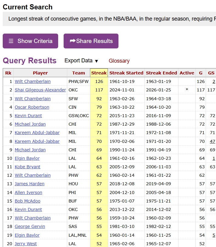 这是SGA连续118场20+,距离张伯伦(126场)的NBA历史纪录只差最后8场!