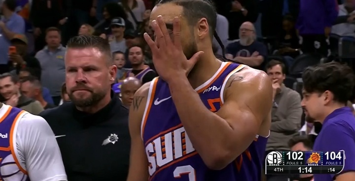 最终判罚:杰明、小波特、曼恩、奥尼尔、阿伦,这五人每人一个技犯!技犯是三比二,所以其中四个罚球抵消,太阳罚一球!罚完之后双方再争球。