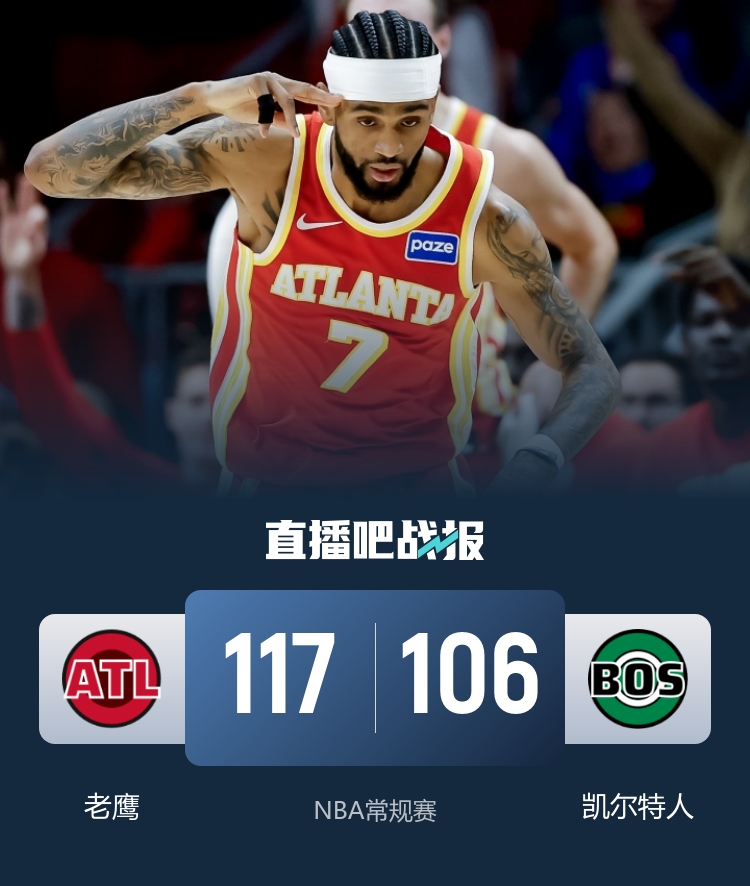 比赛开始,绿军进攻端十分慢热,打了8分多钟还未上双,老鹰外线多点开花下起三分雨,轰出18-2攻击波建立起20分以上领先,次节杰伦·布朗带队开始追分,但老鹰外线还能回应稳住双位数领先,随后老鹰继续发炮8-0再次领先到20分以上,好在绿军回应6-0止血。下半场,老鹰连续三分又是一波11-0稳住20分领先,怀特连得7分止血,双方展开拉锯战,三节老鹰还保持11分领先,末节凯尔特人继续两分两分追,老鹰外线还能回应守住双位数领先,最终老鹰117-106力克凯尔特人。
