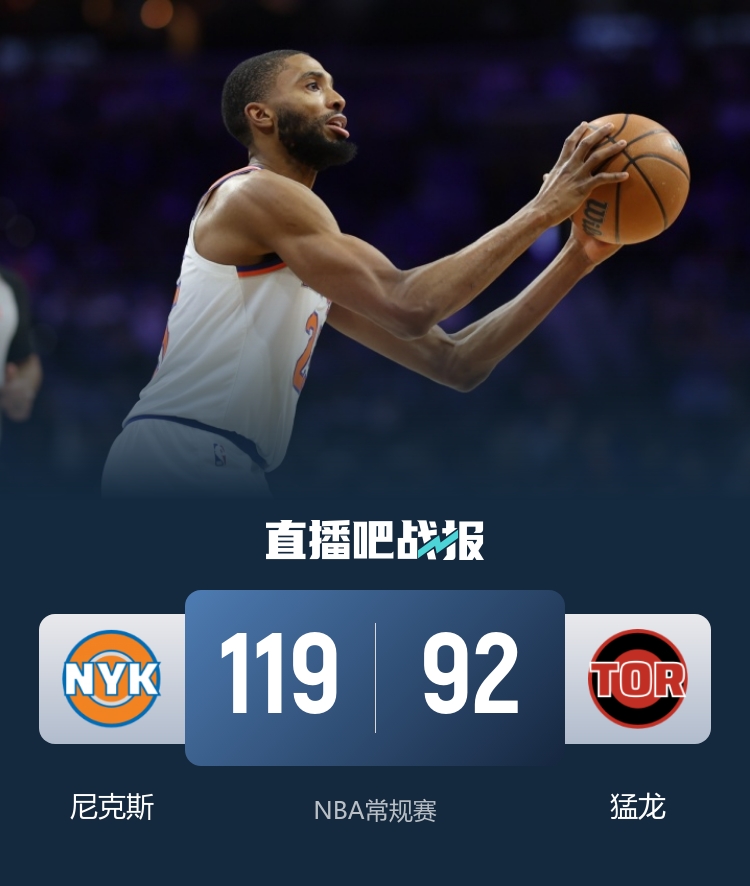 开场后猛龙打出7-0开局,尼克斯状态不佳接连出现失误,并且三分线外频频打铁,阿努诺比一度帮尼克斯追赶比分,但猛龙多点开花在第一节结束时将分差拉大到10分。第二节上来两队围绕10分拉锯,阿努诺比在攻防两端都有出色发挥帮助尼克斯在半场结束时追到只差4分。易边再战,刚上来两队还打的有来有回,第三节后半段猛龙进入轮换后突然进攻突然断电,阿努诺比和布里奇斯在将近8分钟时间里帮助球队打出一波27-4的高潮完成反超。最后一节猛龙依旧一蹶不振,场上分差来到20分以上,比赛失去悬念,最终尼克斯119-92逆转猛龙取得4连胜,猛龙4连胜被终结。
