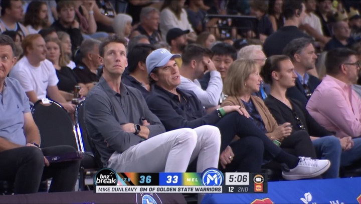 而就在刚刚,记者Olgun Uluc晒图,勇士总经理邓利维以及副总经理拉里·哈里斯目前在新西兰,观看NBL两位26年潜在首轮秀Karim Lopez和Dash Daniels的比赛。