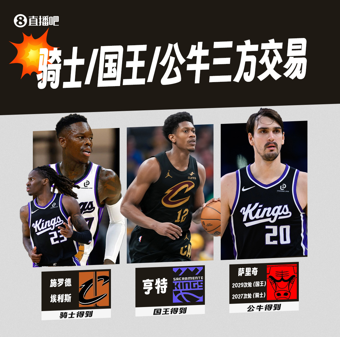 据ESPN消息源透露,这笔交易还涉及第三方芝加哥公牛队,他们将得到国王队前锋达里奥·萨里奇和两个未来的次轮选秀权。