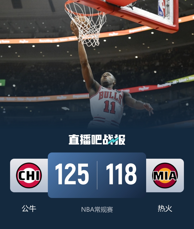 开场后公牛进入状态较慢,但叫了个暂停后打出一波12-0反超比分,此后热火内外开花找回节奏,不过公牛不断追身抢攻得手保持领先优势。第二节上来热火外线接连投进三分完成反超,公牛稍微僵持一阵以后还是被热火将优势扩大,半场过后热火领先7分。易边再战,公牛上来又是慢热,还是通过暂停才找到状态,他们连得10分追上比分,并且在第三节后半段再度掀起攻势完成反超并将优势扩大。最后一节阿德巴约终于进入状态接连拿分为热火吹起反击号角,河村替补登场一度帮助球队打出气势回应,不过热火还是追平比分,关键时刻道苏姆站出来连得10分帮助球队保持领先,热火最后关头没有咬住,最终残阵公牛125-118力克热火结束3连败。