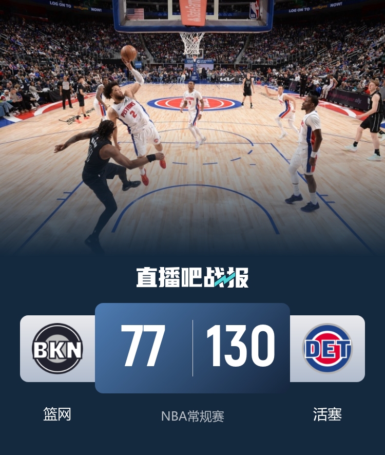 上半场,篮网率先发力占据主动,活塞打出9-2的攻击波强势反超,坎宁安穿针引线,活塞轮番冲击内线频频得手扩大优势,次节篮网进攻端办法不多,哈里斯连投带罚拿分,活塞持续发力,奥萨尔中场抢断飙中压哨三分,半场战罢活塞67-44领先篮网。下半场,篮网继续沉沦,活塞穷追猛打将分差拉开到40分以上,末节篮网仍无起色,活塞万箭齐发将优势扩大到50分以上,最终,活塞130-77狂胜篮网,主场过关。