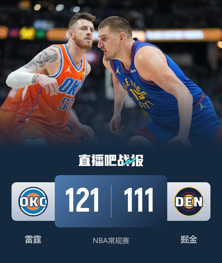 比赛开始,华莱士接连三分开局,沃特森里突外投强势回应,雷霆多点开花建立主动权,沃特森里突外投上双止血,首节雷霆领先6分,次节亚历山大连续打成拿到5分带队领先到双位数,以赛亚·乔和斯特劳瑟对飙三分,约基奇连续追分,半场掘金落后7分。下半场,华莱士连续三分命中,但掘金一度追到差3分,还是华莱士连续命中第7记三分给出回应,随后雷霆外线多点开花领先到16分,末节掘金不放弃还在追分,但雷霆接连抢断反击再次拉开,双方开始练兵,最终雷霆121-111击败掘金。