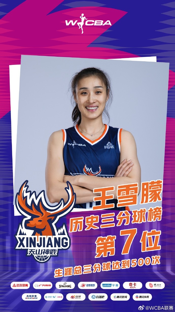 恭喜新疆女篮队员王雪朦成为联赛历史上第7位命中超过500次三分球的球员!