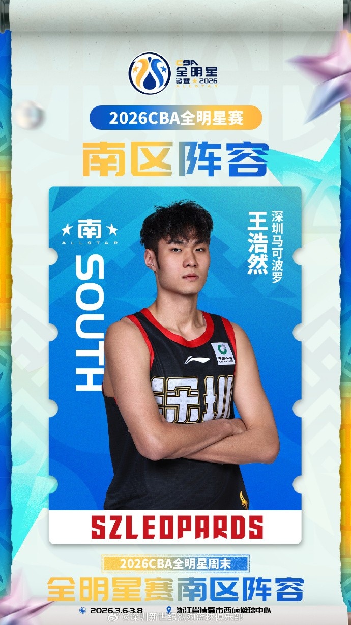 恭喜王浩然入选CBA全明星南区阵容,将与贺希宁并肩出战全明星赛