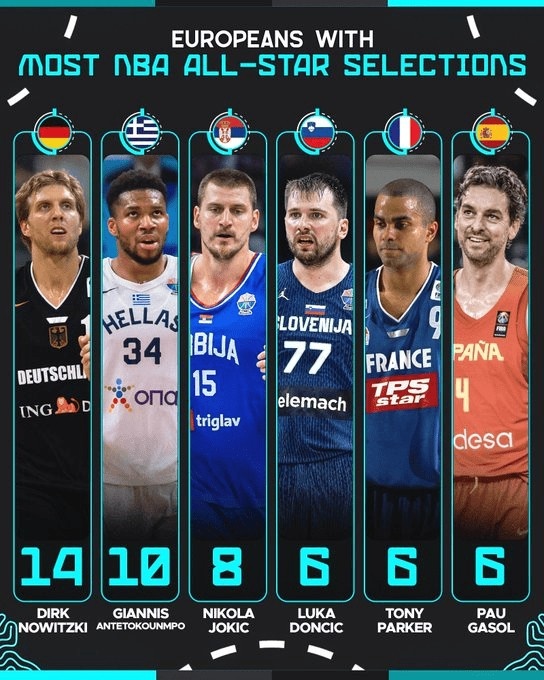 欧洲球员全明星次数:诺天王14次领跑 字约二三 077帕克大加6次