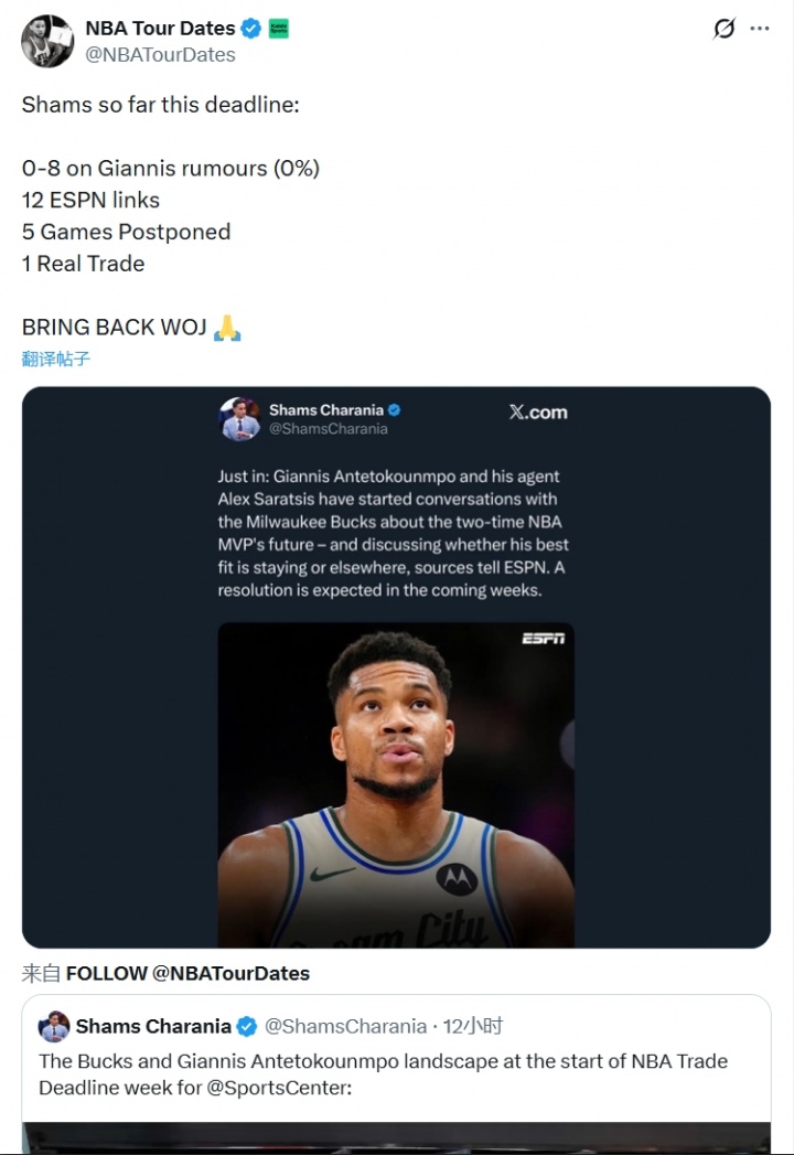 >不如Woj!美网友狂喷Shams:字母哥流言0-8!11篇链接就1个交易!
