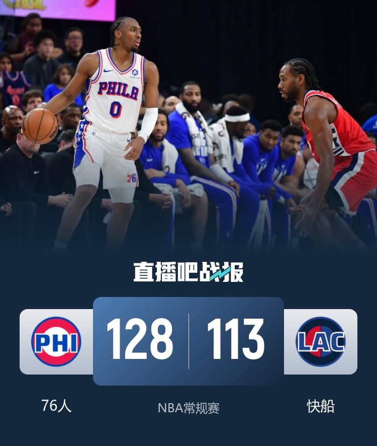 76人(28-21):马克西29分5板6助3断、巴洛26分16板2助2断、恩比德24分5板3助、乌布雷15分3板2助、格莱姆斯14分2板4助、博纳6分3板1助2帽、麦凯恩6分2板4助、埃奇库姆5分3板7助、沃特福德3分2板1助