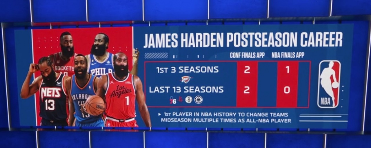 同时,在生涯前三个赛季,哈登两次分区决赛一次总决赛,而后13个赛季,一共2次分区决赛。