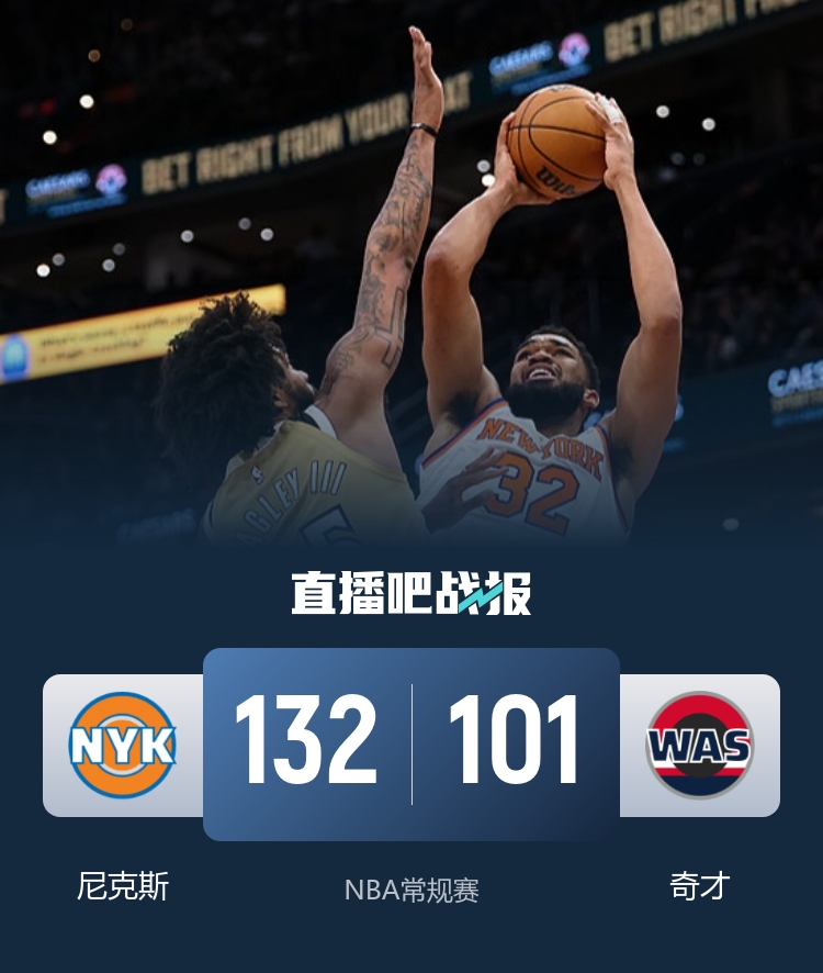 直播吧2月4日讯 NBA常规赛,尼克斯客场挑战奇才。尼克斯31胜18负东部第2,近期豪取6连胜,奇才13胜35负东部倒数第2。
