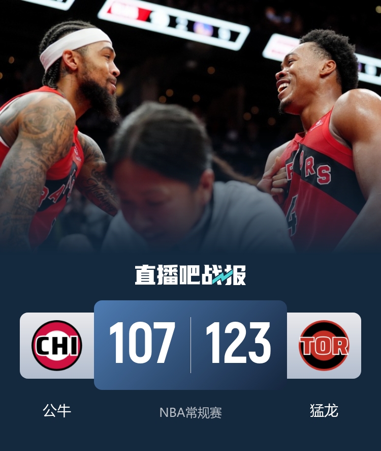 开场后英格拉姆就展现出不错状态,带领猛龙迅速取得领先,博伊尔斯在内线也表现相当活跃,河村勇辉替补登场后连续助攻队友拿分。第二节两队大打对攻战,英格拉姆手感依旧火热,公牛的新援西蒙斯和亚布塞莱也表现神勇,两队一直围绕10分左右拉锯,半场过后猛龙领先7分。易边再战,公牛率先发难抹平分差,猛龙立马回敬一波10-0攻势重新建立领先,此后虽然公牛继续努力追分,但猛龙一直保持两位数优势。最后一节两队进攻效率都有所下降,公牛未能再度追上比分,最终猛龙123-107送公牛3连败。
