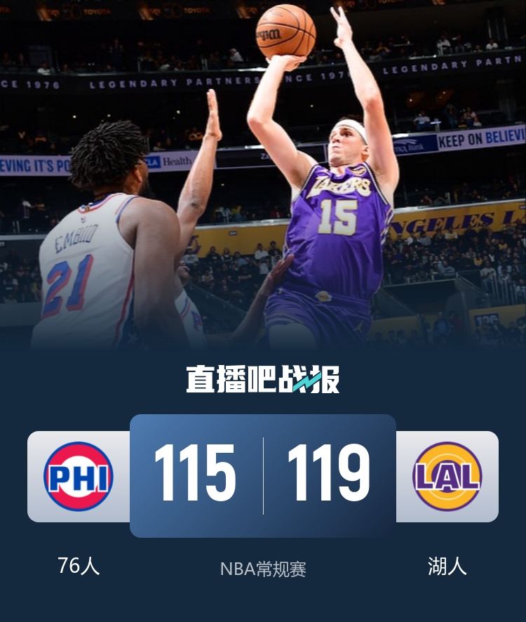 此役一上来恩比德连造杀伤率队轰出10-2开局,东契奇联手艾顿止住颓势,首节结束时76人领先6分,次节回来,里夫斯突然发力单节独得14分,但76人内外结合总能回应,半场战罢,76人保持8分优势。短暂休整后湖人延续追分势头,里夫斯率队不断蚕食分差,三节结束后湖人只落后2分,末节决战,场上形势风云突变,里夫斯手感滚烫连中三分,湖人一波8-0实现反超,76人回敬10-0拉回悬念,决胜时刻斯玛特两罚中一,马克西抛投续命,八村塁轻松吃饼,76人追分未果,最终湖人119-115终结76人五连胜。