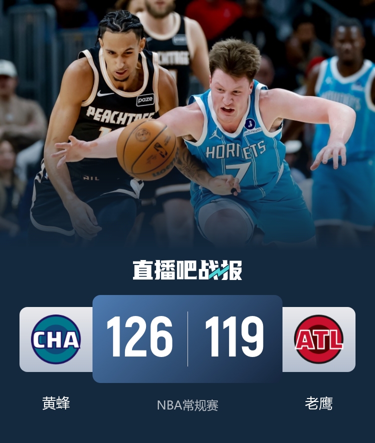 比赛开始,双方都迅速进入状态,奥孔武和里萨谢接连外线发炮助老鹰建立主动权,黄蜂全民皆兵回应追分并咬住,两队外线对飙,首节老鹰领先3分,次节双方展开胶着拉锯战,克尼佩尔接连三分单节上双,但老鹰替补也能回应,双方半场打成60平。下半场,双方继续回合制比赛,比分始终拉不开,黄蜂建立主动权后老鹰7-0瞬间抹平分差,最后2分钟黄蜂11-0再次建立8分领先,末节老鹰全员发力轰出小高潮再次反超比分,但迪亚巴特吃饼还能回应,关键时刻克尼佩尔命中三分,沃克关键三分不中,米勒两罚杀死比赛,最终黄蜂126-119力克老鹰。