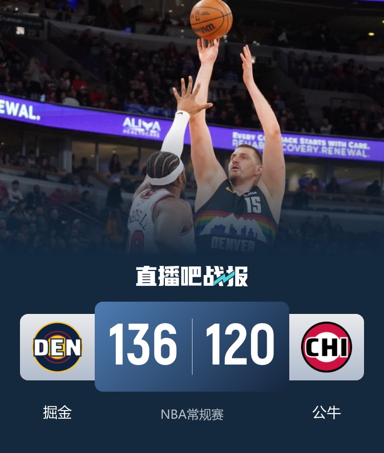 开场后两队在外线对飚三分,掘金手感更加火热取得领先,约基奇表现全面带领球队打得游刃有余,但约基奇下场休息后公牛趁机发动反扑缩小分差。第二节上来掘金进攻依旧没有太多起色,公牛趁机反超比分,约基奇重新回来后打得有些放松,虽有好转但依旧没有完全扭转局面,上半场公牛领先6分。易边再战,掘金在约基奇的带领下重新打出攻势夺回领先,约基奇两节半的时间就三双到手,但第三节尾声掘金突然断电,公牛一波17-2的攻势再度完成反超。末节决战,约基奇带队回应了个20-2的高潮直接将分差拉大到两位数,此后公牛无力回天提前鸣金收兵,最终掘金轻松拿下公牛结束3连败,公牛遭遇4连败。
