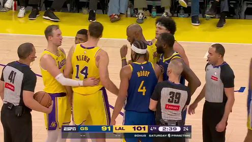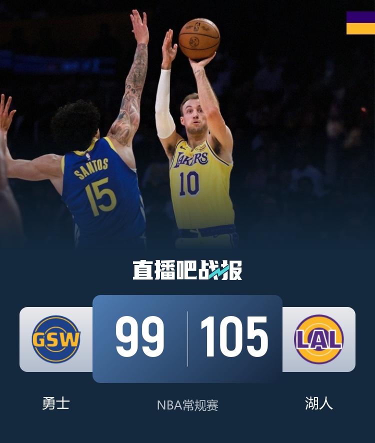 首节开打后斯潘塞先拔头筹,湖人连中三分强势回应,肯纳德登场外线张手就有,两队你来我往比分紧咬,首节结束时勇士领先1分,次节回来,双方进攻稍显滞涩,勇士稳扎稳打保持微弱优势,半场战罢,勇士依然领先1分。易边再战后詹姆斯连投带罚独揽12分,斯玛特和范德比尔特续上火力,湖人连续轰出得分高潮后来居上,三节结束后湖人反超确立8分优势,末节上来,勇士下起三分雨迫近比分,湖人回敬13-2制胜攻击波,勇士逆转未果,最终湖人105-99击败对手迎三连胜。