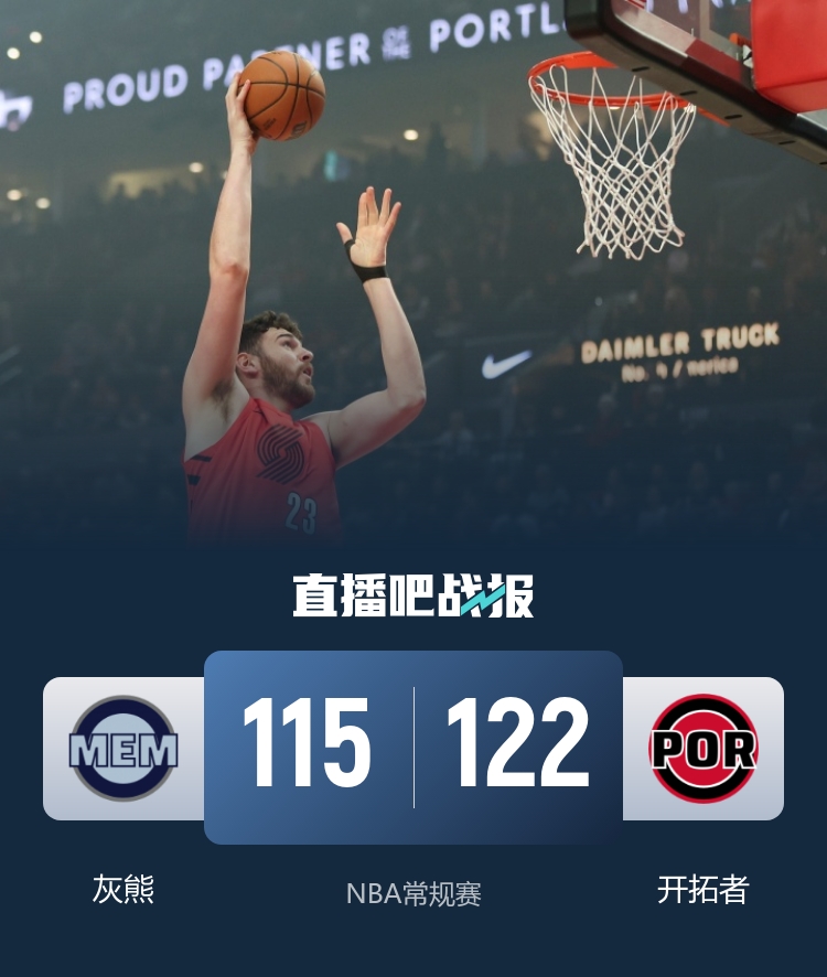 灰熊(20-31):普罗斯珀25分5板、斯莫尔22分6板4助、杰罗姆13分1板1助、GG·杰克逊11分8板2助2帽、李凯尔11分6板2助2断2帽、波普11分4板、克莱顿8分4板7助3断、马沙克8分1板1助6断、亨德里克斯6分1板2助