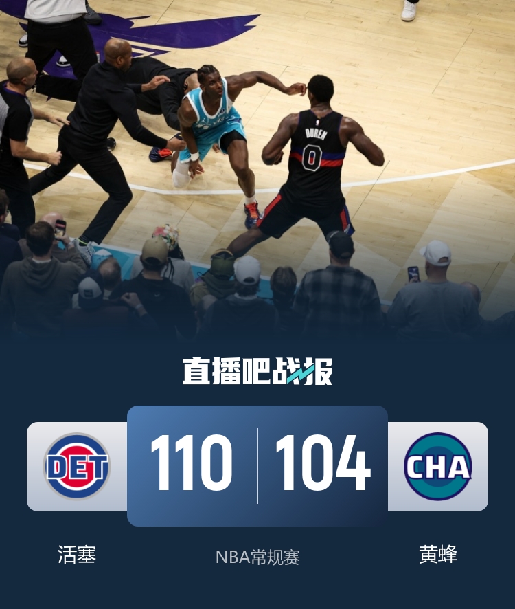 开场后活塞连得6分抢占先机,随后两队都是频频冲击内线上演暴扣,米勒一度帮助黄蜂反超比分,活塞及时给出回应,黄蜂连中四记三分在首节结束时再度反超,其中包括一记中场压哨三分。第二节上来黄蜂外线手感火热接连命中三分,但他们场上失误也不少,活塞在半场结束前打出一波14-2的攻势夺回领先。易边再战,虽然黄蜂率先打出攻势上来就反超比分,但杜伦又是在内线接连发挥帮助球队打出9-0稳住局面,随后杜伦被迪亚巴特犯规引发两队大规模冲突,迪亚巴特、布里奇斯、斯图尔特和杜伦四人遭到驱逐,冲突过后活塞延续攻势将分差拉大到两位数。第三节尾声黄蜂重新稳住阵脚再度发起反扑,第四节黄蜂主帅查尔斯·李怒喷裁判也被驱逐,黄蜂一度追到只差4分,但连续三分机会没有把握住,詹金斯打进关键两分,黄蜂未能翻盘,最终活塞110-104终结黄蜂9连胜。