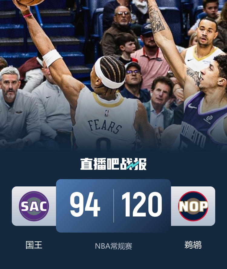 此役一上来双方迅速找到节奏,威少和德罗赞率队一度占优,锡安联手墨菲及时回应,鹈鹕多点开花后来居上,首节结束时鹈鹕领先5分,次节回来,鹈鹕延续火力不断扩大优势,国王进攻出现停滞,雷诺连投带罚苦苦支撑,半场战罢,鹈鹕确立15分优势。易边再战后国王进攻毫无起色,鹈鹕稳扎稳打牢牢占优,三节结束后鹈鹕已经领先25分,末节上来,两队陆续换上替补,比赛提前失去悬念,最终鹈鹕120-94大胜送国王13连败。