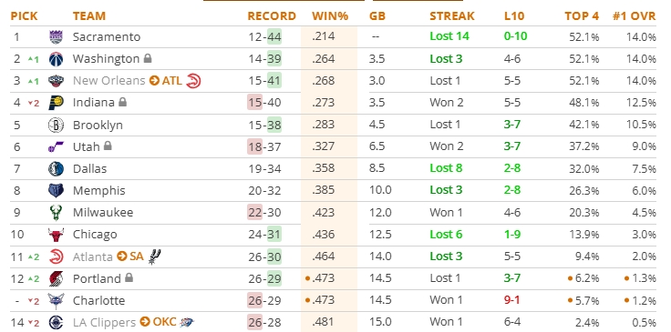 目前选秀顺位概率更新:
