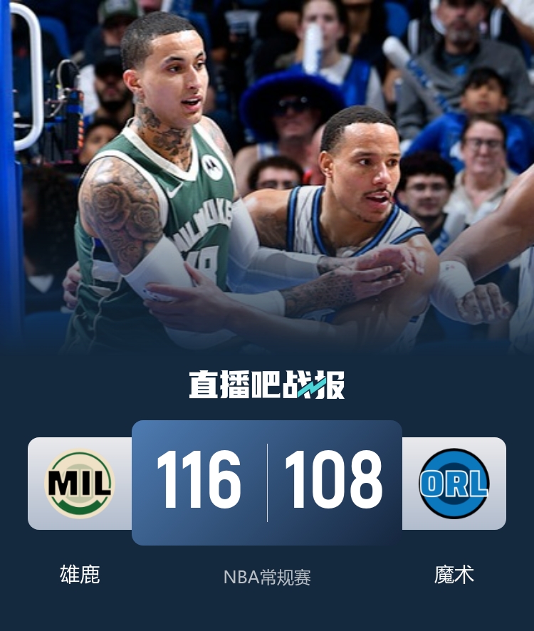 比赛开始,贝恩连中3记三分,但库兹马里突外投连砍11分强势回应,双方展开拉锯战,贝恩继续保持手感扔进第5记三分,首节魔术领先4分,次节双方展开拉锯战,魔术试图拉开比分但雄鹿总有人能回应,小波特连续突破带领雄鹿半场反超1分。下半场,双方比分继续胶着,托马斯站出来里突外投单节轰下15分,雄鹿三节反超5分,末节双方始终拉不开比分,小波特达成三双,贝恩接连三分能回应,关键时刻班凯罗隔扣扣飞,特纳关键三分命中后托马斯超远三分杀死比赛,最终雄鹿116-108魔术。