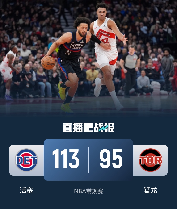 开场后顶上先发的里德扮演奇兵频频拿分,活塞早早取得领先,猛龙进入状态较慢,场上分差被拉大到两位数。第二节上来猛龙掀起反扑,坎宁安三分三连击扑灭猛龙反扑势头,此后猛龙多次追分都被坎宁安带队及时回应,半场过后活塞领先15分。下半场回来两队你来我往打得有来有回,场上分差一直在15分左右拉锯,第三节后半段活塞加强防守打出攻势将分差拉大到20分以上。最后一节猛龙进攻上依旧没有能够形成连续性,猛龙追分无望撤下主力,活塞也鸣金收兵,最终活塞113-95轻松击败猛龙取得3连胜。