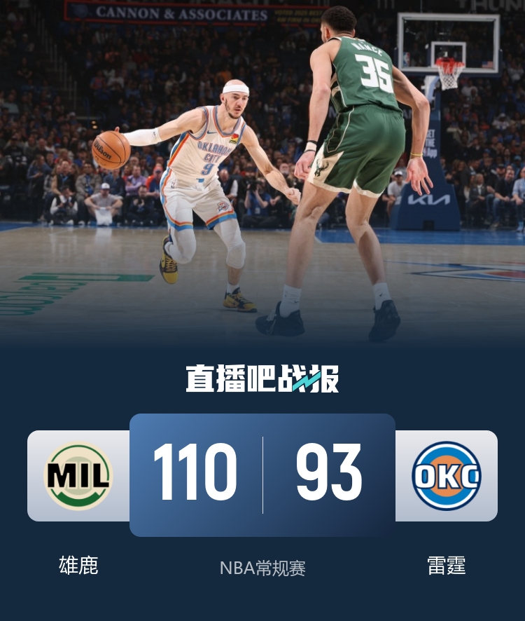 比赛开始,雄鹿从内线打起,但雷霆连续3记三分回应,随后雄鹿全民皆兵保持主动权,以赛亚·乔带队咬到差5分,次节托皮奇中投拿到生涯首分,卡鲁索连续3记三分直接追平,但雄鹿迅速回应14-0建立领先,切特连得11分止血,半场雄鹿还领先12分。下半场,雄鹿陷入停滞半节仅得4分,但雷霆也没有抓住机会追分,雄鹿迅速调整多点开花还是保持16分领先,末节雄鹿上来6-0拉开20分以上领先,随后雄鹿再也没有给机会,最终雄鹿110-93大胜雷霆。