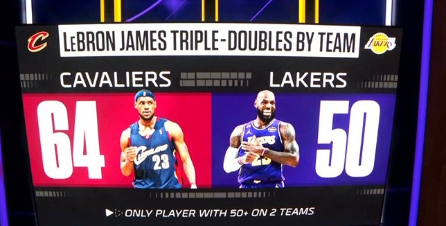 骑士64次+湖人50次!詹姆斯在两支球队拿到50次三双 历史唯一