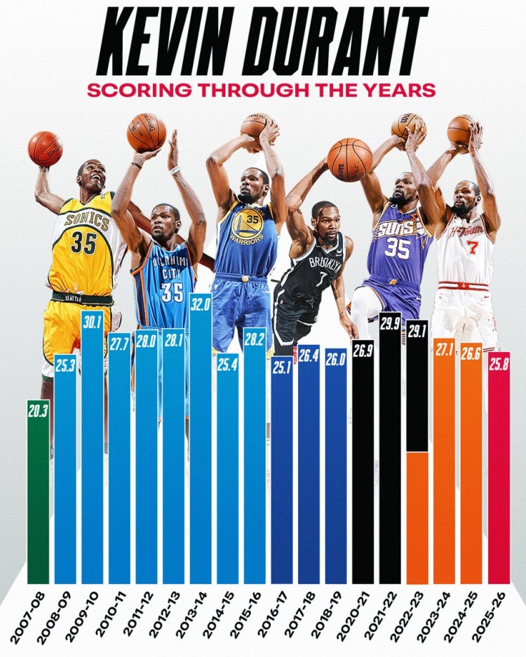 >得分机器!新秀赛季以来 杜兰特每赛季场均得分均超过25分!