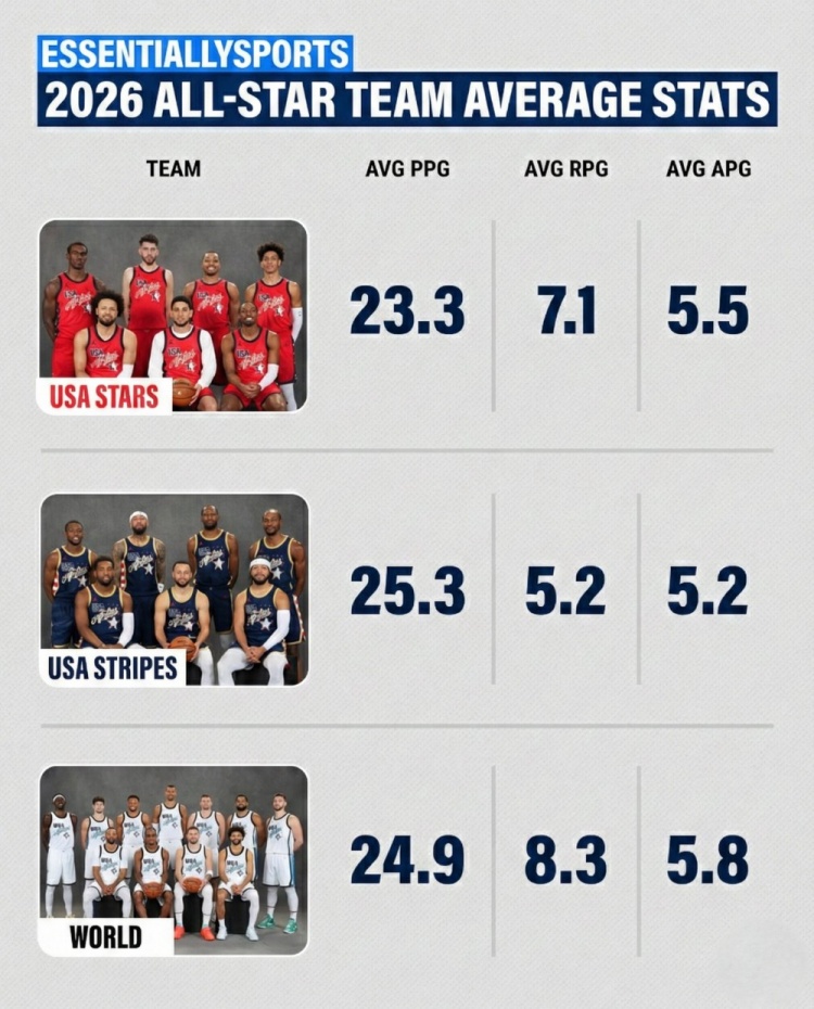 全明星3队球员场均数据比拼!条纹队场均25.3分最高 世界队最全面