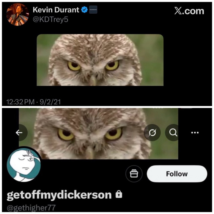 网友发现,getoffmydickerson的资料背景页面的猫头鹰图片,曾经是杜兰特大号的推文内容,媒体BrickCenter表示:“是的,这百分百是杜兰特。”