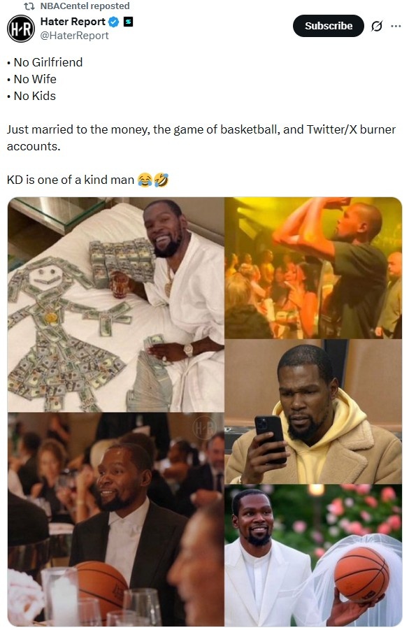 美媒评价杜兰特:没女朋友&妻儿 与篮球&推特&钱结婚 KD独一无二
