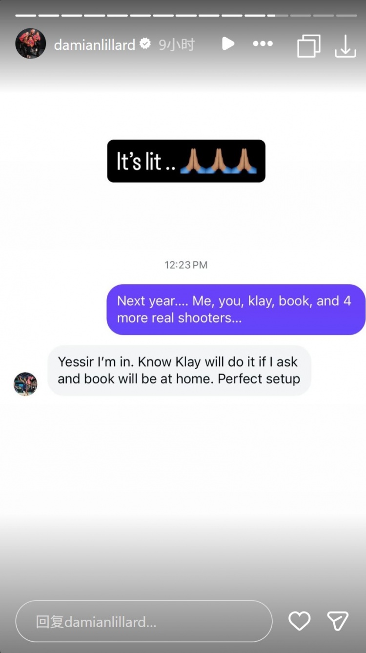 利拉德随后在INS上晒出了自己和库里的一段聊天记录,两人相约明年一起参加三分大赛,具体如下: