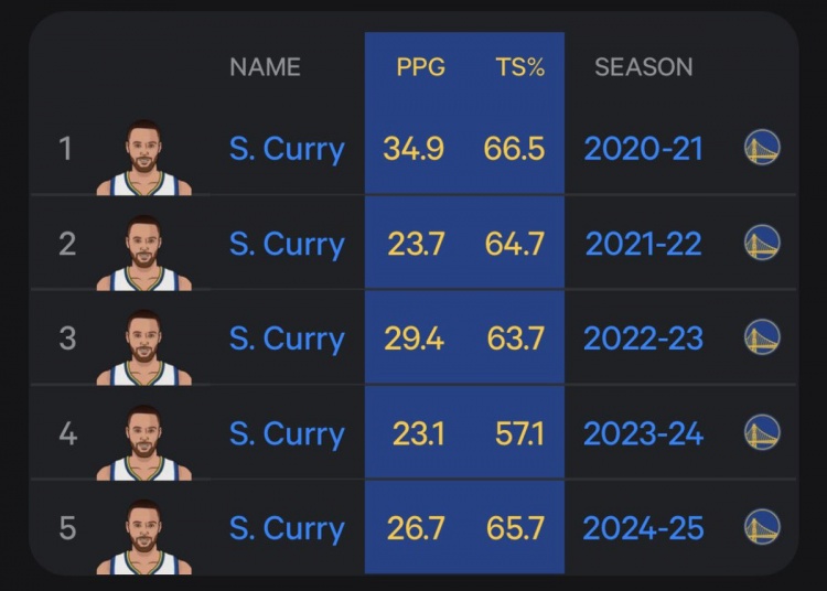偶数年较低!库里近5年全明星后场均数据:25年26.7分 24年23.1分