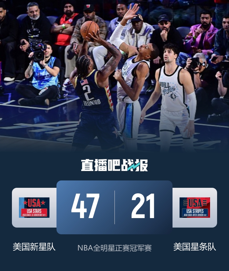 星条队:伦纳德31分3板2断、布伦森8分1板2助、杜兰特7分1板1助、詹姆斯2分2板4助、英格拉姆1板、布朗1助2帽