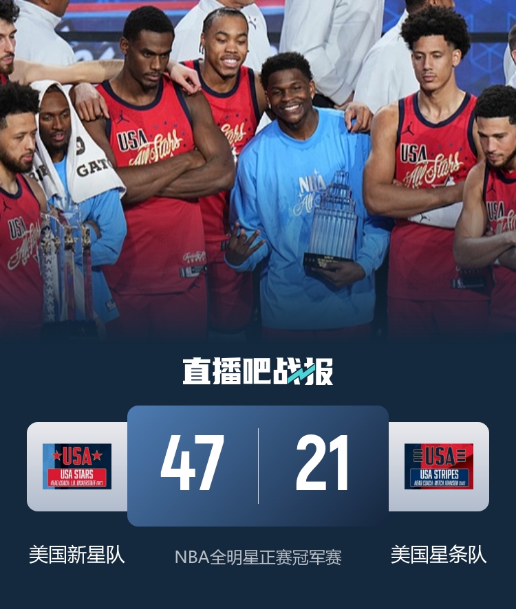 星条队:米切尔6分1板、詹姆斯5分4板、布朗4分2板1助、布伦森3分2板1助、福克斯2分1板2助、伦纳德1分1板1助、杜兰特1板