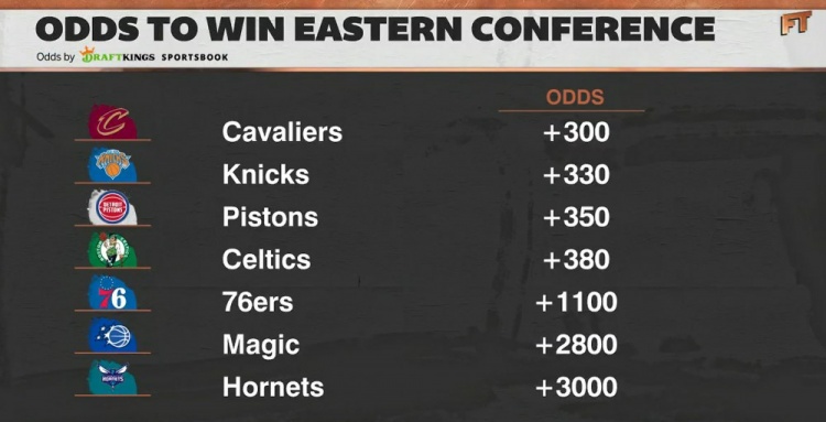 直播吧2月17日讯 博彩网站DraftKings最新东部冠军赔率显示,骑士高居第一,具体如下: