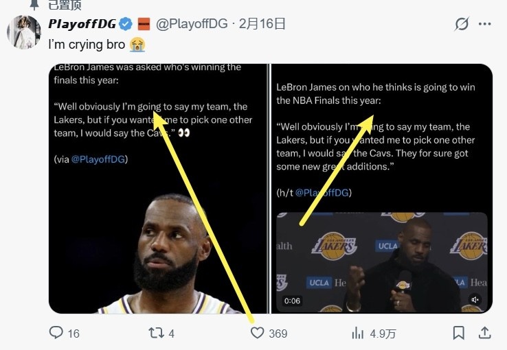 直播吧2月20日讯 一位社媒X上的网友PlayoffDG近日利用AI工具制作了湖人球星詹姆斯的采访视频。