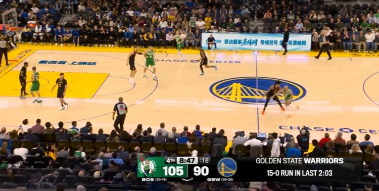 大举反击!小佩顿内外开花连得5分 勇士2分钟轰15-0缩小分差