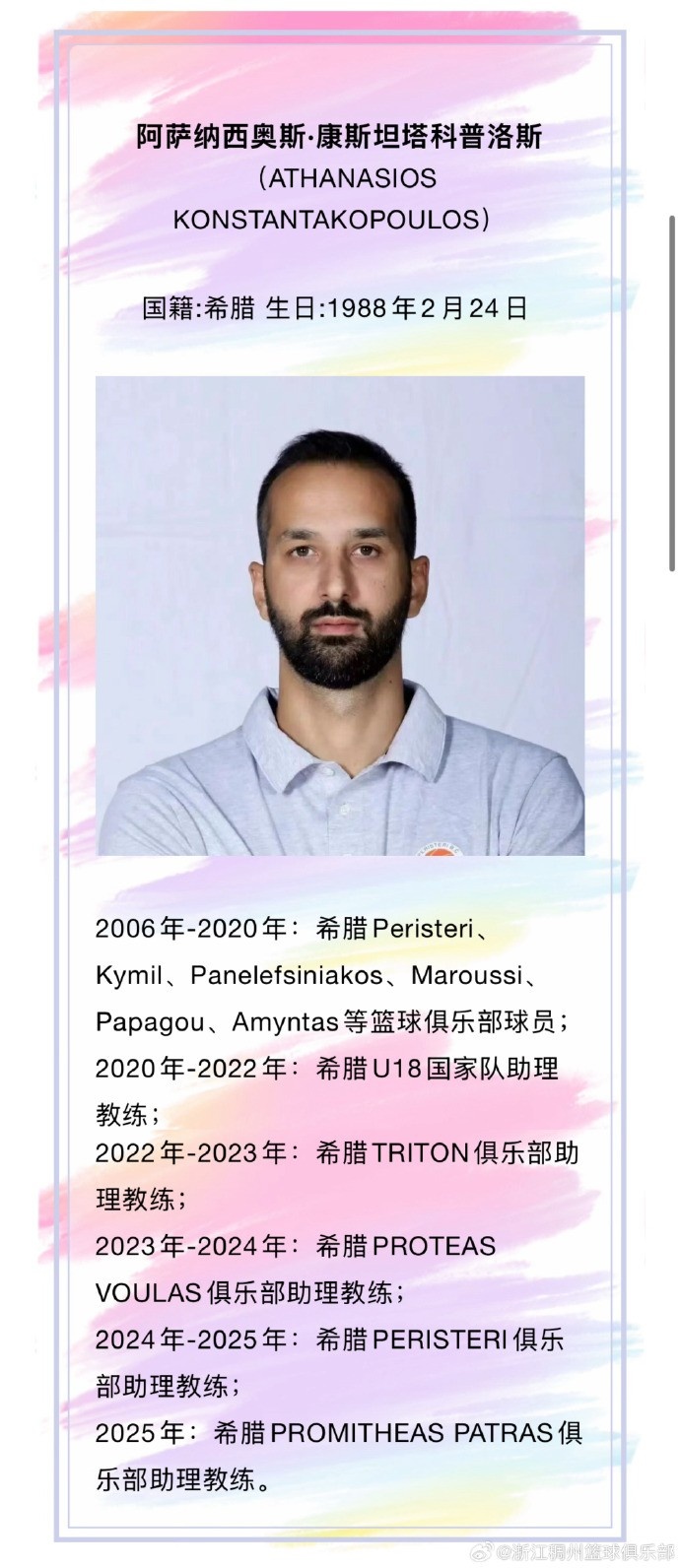 官宣|为进一步加强教练组力量,优化教练团队结构,我俱乐部现已正式聘请希腊籍教练员阿萨纳西奥斯·康斯坦塔科普洛斯(ATHANASIOS KONSTANTAKOPOULOS),担任浙江稠州金租男篮助理教练。