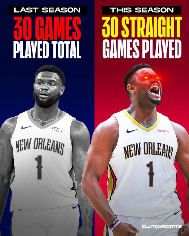 直播吧2月20日讯 据统计,锡安赛季至今共计出场40场比赛,且已经连续出场了30场比赛。