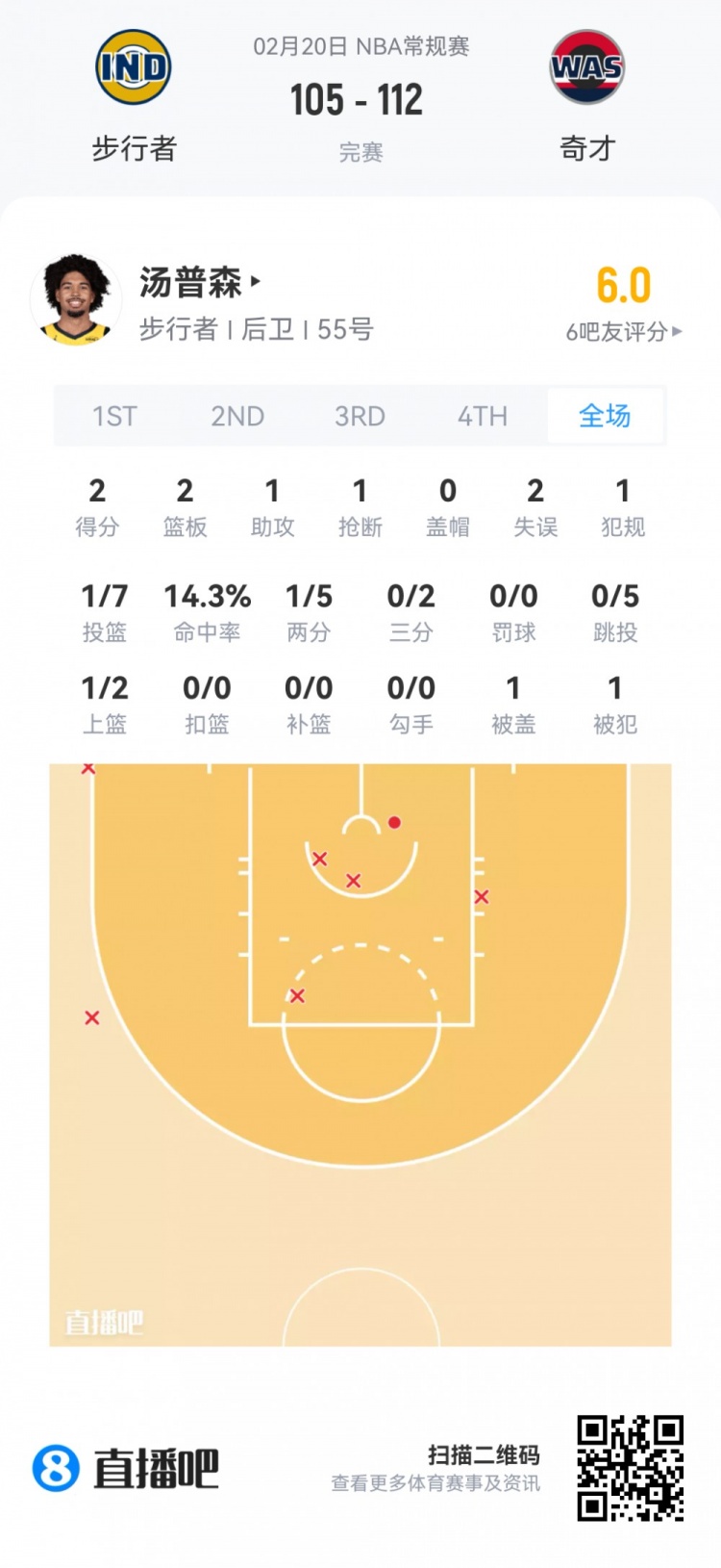 步行者落选秀伊桑·汤普森 登场26.8分钟