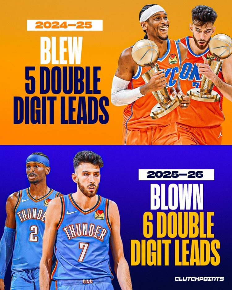 直播吧2月21日讯 据美媒ClutchPoints统计,上赛季,雷霆在夺冠的历程中(常规赛+季后赛)一共仅5次在手握两位数领先的情况下被逆转。