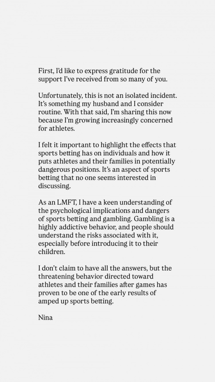我认为有必要强调体育博彩对个人的影响,以及它如何将运动员及其家人置于潜在的危险境地,这是体育博彩中似乎没人愿意讨论的一面。