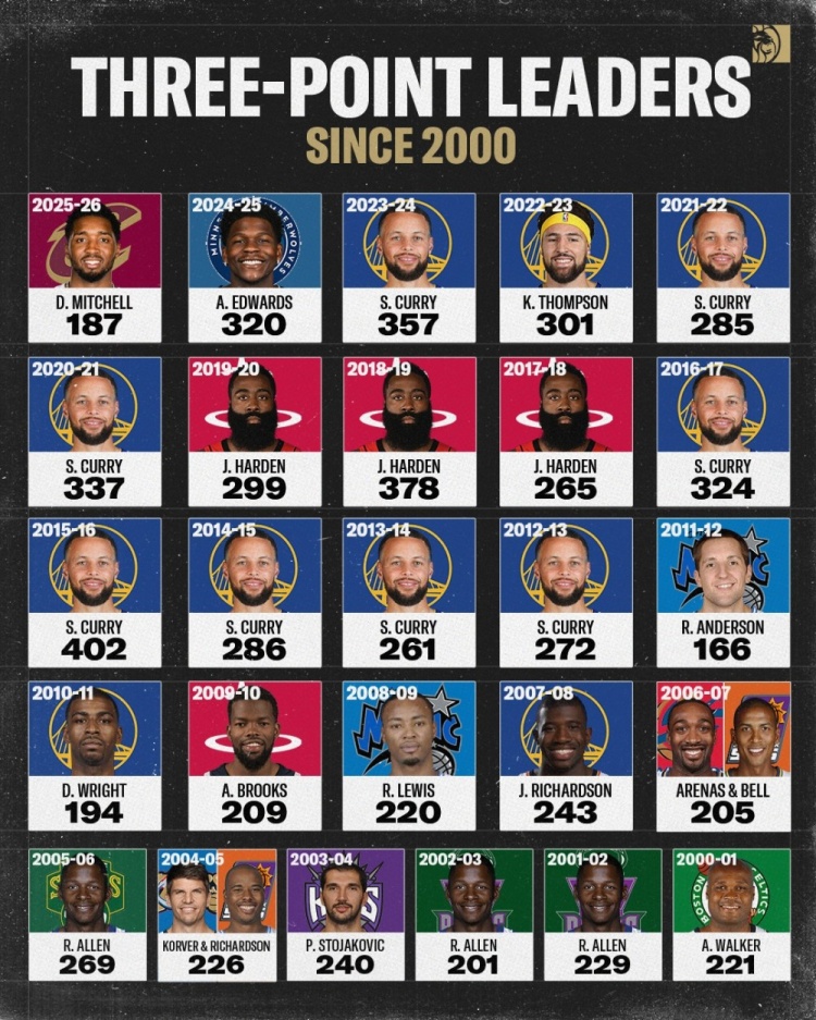 >21世纪至今各赛季三分命中数第一人!库里8季第一 大幅拉升总数