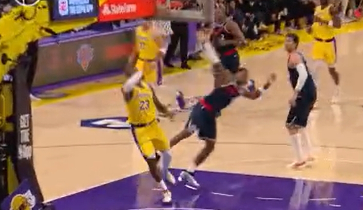 >詹姆斯篮下接斯玛特长传正要起飞 被马瑟林造了个进攻犯规