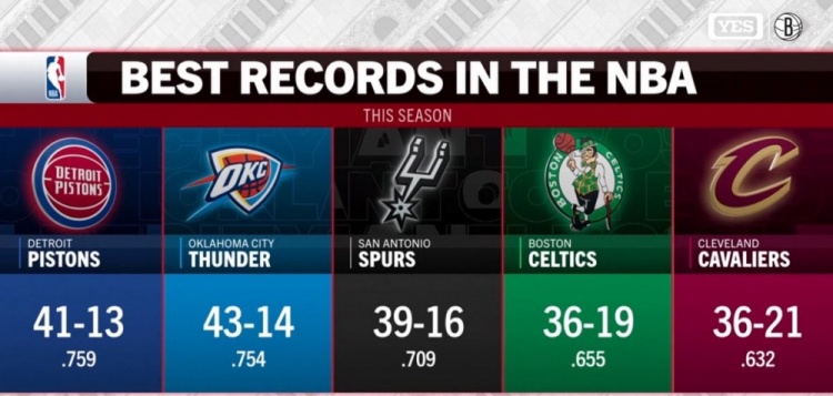 >谁能想到?本赛季活塞胜率75.9%反超雷霆升至联盟第一 马刺第三
